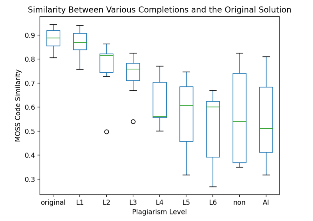 A kutatók megállapítása szerint a GPT-J által előállított kód olyan változatos felépítéssel készült, hogy mind a hét feladatban átcsúszott a MOSS szűrőjén, a nem-plágium megoldásokhoz hasonló értékekkel. Mindössze minimális változtatásokra volt szükség, hogy a "syntax error" jellegű egyszerű hibákat javítsák. Minderre a szerzők szerint egy programozói tudás nélküli személy is képes lett volna, hogy elindítsa a kód generálást, majd Google segítségével javítsa a hibakódokat.