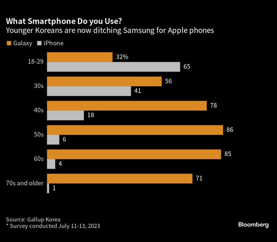 Az egyik lefrissebb, reprezentatív felmérés éppen a világ vezető mobilgyártójának, a Samsung Electronicsnak otthon adó Dél-Korea korcsoportok szerinti felhasználási, illetve tulajdonlási szokásait vizsgálta, mely alapján elég határozottan körvonalazódik, hogy még a Samsung hazájában is a 18-29 éves korosztály csaknem kétharmada iPhone-t használ.