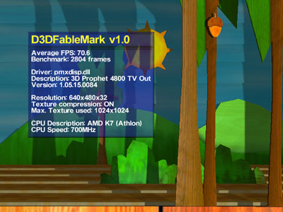 [PowerVR lev.lista] Újabb benchmark programmal és technológiai demóval bizonyítja KYRO architektúrájának erejét -- és programozói képességét -- a PowerVR: a ma megjelent FableMark benchmark program a nyúl és a teknős versenyét meséli el egy virtuális bábjáték formájában, több, mosott élű árnyékot használva. A program nyilvánvalóan a Constant Stencil, azaz a bármilyen bitmélységen elérhető stencil buffer előnyét és a kiváló sebességét demonstrálja.