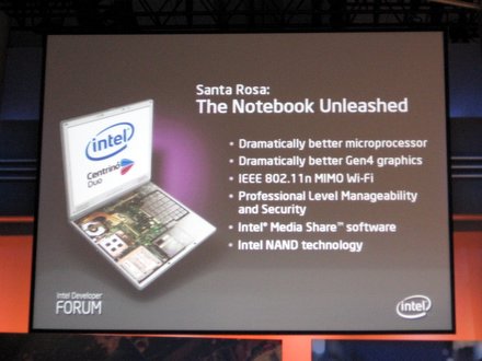 A noteszgépek sebességét azonban nem csak új processzorokkal növelné az Intel. A bemutatón látható volt egy olyan prototípus, amelybe 256 megabájt NAND flash memóriát építettek, ennek segítségével a rendszerindítás látványosan felgyorsult. Maloney elmondta, a gépekbe szinte akármennyi flash memória beépíthető, így akár lehetőség van arra is, hogy az egész operációs rendszer a lassú merevlemez helyett a flash memóriában fusson, bár természetesen a beépített memória megnöveli a költségeket. A NAND-technológián alapuló megoldás is a Santa Rosa platform része lesz.