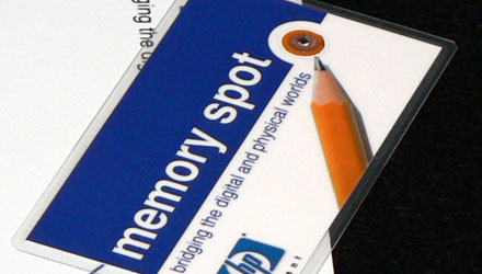 A HP legújabb fejlesztései egyike egy igazán apró rádiófrekvenciás memórialapka, a Memory Spot, mely rendkívül kis méretének köszönhetően az élet számos területén felhasználható. A mindössze 1,4 x 1,4 mm-es lapkát az "öntapadós" kivitel mellett szó szerint integrálni lehet termékekbe, akár papírlapokba is, ugyanis semmilyen tápellátást nem igényel, teljesen passzív eszköz. A minden szükséges logikát, antennát és egyéb alkatrészt egyetlen szilíciumlapkában integráló chip működéséhez szükséges energiát indukciós elven maga az író-olvasó egység biztosítja.