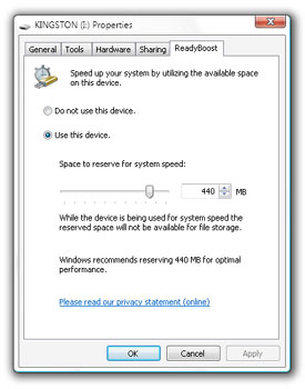 Az adatokat titkosítva írja a flash memóriába a Vista, azaz illetéktelen kezekbe kerülése esetén sincs ok az aggodalomra. A ReadyBoost funkció elsősorban noteszgépek esetében jöhet jól, amelyek az asztali gépekénél lassabb merevlemezzel rendelkeznek. A merevlemez ritkább használata miatt annak energiatakarékos funkciói is kihasználhatók (például egy Word-dokumentum szerkesztése alatt hosszú percekre kikapcsolható az egység), jelentősen növelve a noteszgép akkumulátoros üzemidejét. Egyes, korai tesztek szerint a noteszgépek üzemideje akár negyedével is megnövekedhet ennek a megoldásnak köszönhetően.