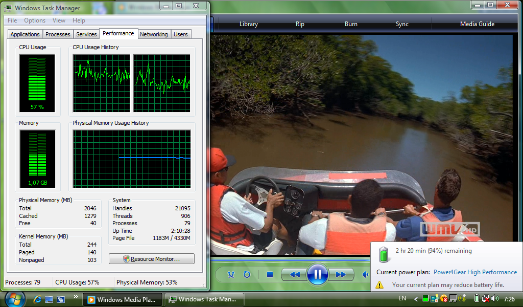 Az akkumulátort a gépre telepített Power4Gear gyári segédszoftver menedzseli, három üzemmóddal, melyek közül kiválasztható olyan is, amelyben a gép akár öt és fél órán keresztül képes üzemelni. Ha az Intel videochip helyett az NVIDIA 9300M GS lapkát választjuk, akkor az elérhető maximum egy órával kevesebb. Ha nem a leginkább energiatakarékos üzemmódban várjuk el a lehető legtöbbet, akkor is legalább két és háromnegyed órán keresztül mozizhatunk a géppel. Örömteli, hogy a netbook processzorhűtő ventilátora visítással, sivítással nem rondít az élvezetekbe, csak közel hajolva hallható halk fújással jelzi, hogy épp szükség van rá.