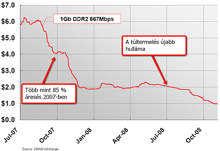 Mikor idén év elején 2 dollár/gigabit alá esett a DDR2-memória ára, az egész ipar és megfigyelők az árak emelkedését várta. Ezek az előrejelzések végül oda vezettek, hogy a gyártók agresszívan növelni kezdték termelésüket, így a már egyébként is túlzottan magas készletszintek tovább emelkedtek, az árak pedig emiatt az év második felében újabb mélyrepülésbe kezdtek. Az azonnali üzletkötések decemberben már gigabitenként 70 dollárcent, vagyis 150 forint alá kerültek a DRAMeXchange memóriatőzsde adatai alapján. A piackutató cég becslése szerint csak a tokozási és tesztelési költség 35-40 centet tesz ki, így a szilíciumért mindössze gigabitenként 30 centet kapnak a DRAM-gyártók nagyjából -- költségük viszont átlagosan 1 dollár környékén mozog egy gigabites chip esetében.