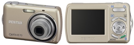 Az Optio E70 130 dollár alat kínál 10 megapixeles felbontást és 3-szoros optikai közelítést, a P70-nél némiképp vaskosabb és nehezebb, 160 grammos, 97x61x23 milliméteres burkolatban. Az E70 hátoldalán 2,4 hüvelykes, csekély, 112 ezer képpont felbontású kijelző található. Az olcsóbb kompakt a P70-nel megegyező mértékben engedi állítani az ISO-érzékenységet és rendelkezik arcfelsmerő autofókusszal is. Az olcsóbb Optio két ceruzaelemmel, illetve az ezeket kiváltó AA akkumulátorokkal üzemeltethető.