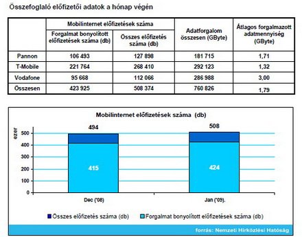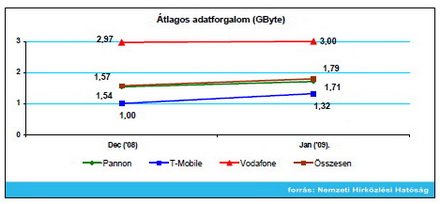 Az előfizetők számán túl a három szolgáltató közreadja a mobilnetezők által forgalmazott adatok mennyiségét is. Itt decemberben még a Vodafone volt az első 273 terabájttal, a T-Mobile a második 221 terabájtttal, a Pannon ügyfelei messze lemaradva mindössze 157 terabájtot forgalmaztak összesen. Januárra viszont a Pannon és a T-Mobile nagyot ugrott, miközben a Vodafone esetében csak csekély növekedés látszik.