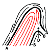 Pont, avagy sziget, széttartó és újra összezáródó vonalak, és egy rövid vonal.