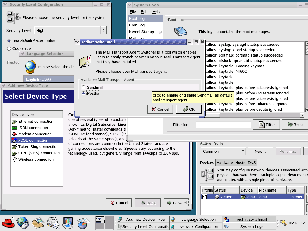 Most, hogy így körbejártuk a rendszert, bújjunk bele, használjuk egy kicsit! Első utunk valószínűleg a System Tools vagy a System Settings menübe fog vezetni, ahol az OS beállításához szükséges grafikus eszközöket találjuk. Az itt felsorolt programok legtöbbje önálló, Pythonban megírt GNOME 2 alkalmazás; a Red Hat 7.3 óta alaposan kibővült a választék. Érdekes újdonság, hogy nem kell minden egyes rendszerbeállító program indulásakor bepötyögnünk a root jelszót, a legtöbb konfigurációs eszköz a sudo-hoz hasonlóan a PAM timestamp modulját használja, magyarán a rendszer öt percig engedélyezi a root jelszavát ismerő felhasználó számára az ilyen programok futását jelszó nélkül is, miközben a panel jobb sarkában végig látszik egy figyelmeztető ikon, egy kulcs.