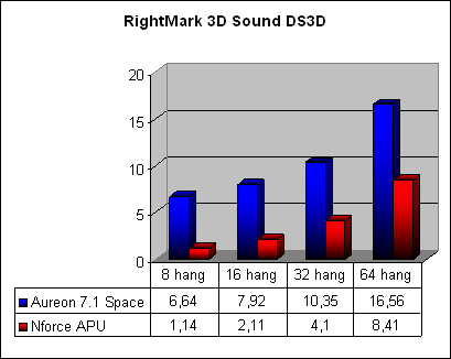 DirectSound3D esetén az egymáshoz képesti százalékos eltérés hasonló, azonban 64 hang esetén ez már a processzor plusz 8 százalékpontos terhelését jelenti az Aureon használatakor.