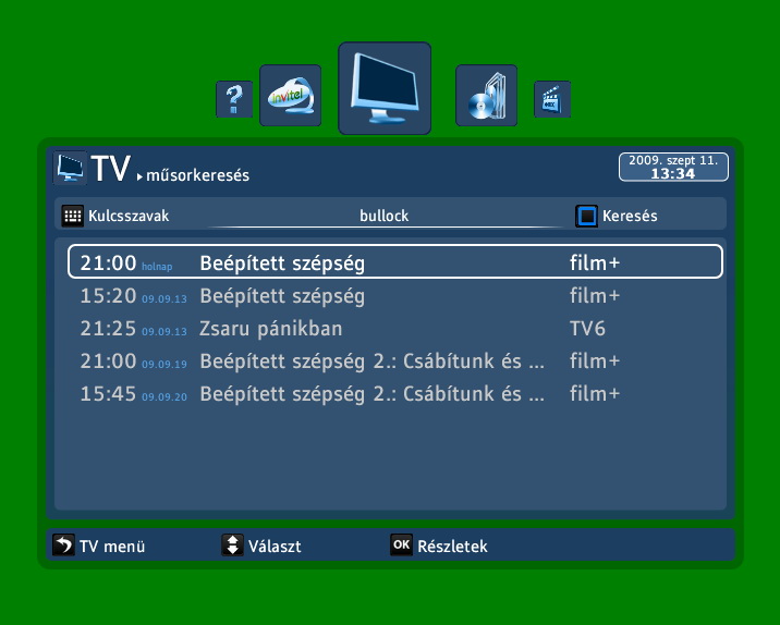 Szintén a Mediaroom egyik erőssége a korrekt keresés. A T-Home IPTV keresőjébe bármilyen kifejezést beírva, a rendszer találatokat listáz a Port.hu-tól kapott műsorinformációs adatbázisból. A lista elemei viszont nem korlátozódnak címekre, lehet keresni rendezőre, szereplőkre, vagy akár a leírásban lévő kifejezésekre is.