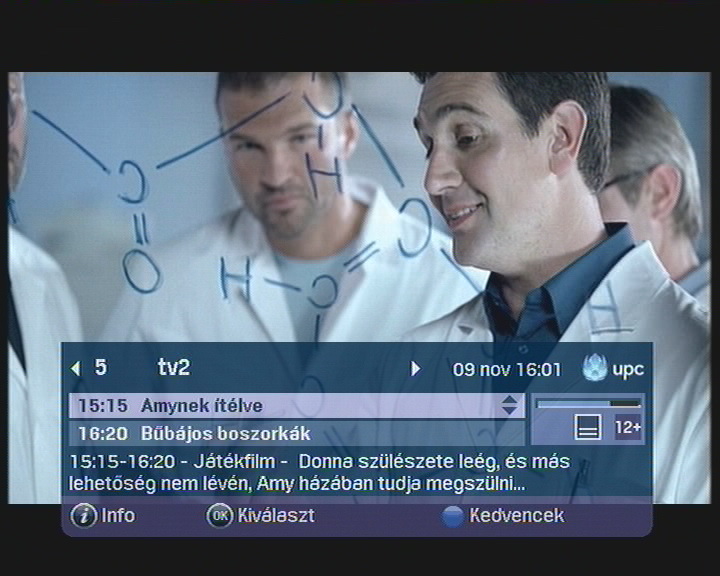A tévé bekapcsolása után szintén élőképpel kezdünk, s a menü gombot megnyomva feltűnik az adott csatorna alapinformációit mutató felület a Port.hu-tól nyert EPG adatokkal. Apró ikonok jelzik, ha elérhető másik nyelv, vagy felirat, de ez utóbbi sajnos itt sem jellemző a tartalomszolgáltatók miatt. Továbbá egy folyamatsáv jelzi, hogy hol jár éppen az aktuális adás. A menüben lapozgatva végig lehet futni a csatornákon anélkül, hogy képet kellene váltani, de ha már a kedvencek és a teljes kínálat közt ugrunk, akkor a kép is változik.