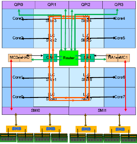 Az adatok irányításáért a chipeken található routerek felelnek. Egy router nyolcportos, ebből egy-egy port jut a QPI linkekre, míg a belső cache és a memóriavezérlők felé szintén egy-egy. A miniatűr routernek szélsőséges esetekben akár 100 GB/s forgalmat is kell tudnia kezelnie anélkül, hogy eldugulna. A chip cache által tárolt adatok külső lekérdezését két ügynök kezeli, valamint rajta keresztül folyik át a meg nem talált adatok lekérése, és a koherenciaprotokollok közvetítése.
