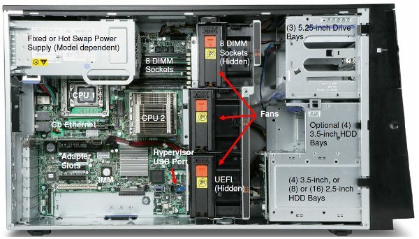 Mivel a torony kivitelű gépeket rendszerint szeparáltan üzemeltetik és nem képezik tárolóhálózat részét, ezért fontos a megfelelően nagy lokális háttértár-kapacitás. Az IBM mérnökei is gondoltak erre és úgy alakították ki a szervert, hogy akár 8 darab 2,5" SAS vagy 4 darab 3,5" SATA diszket is befogadjon, egy külső doboz segítségével pedig összesen akár 16 2,5" vagy 8 3,5" lemez is csatlakoztatható, ami 16 terabájt kapacitást is jelenthet - a RAID 0/1/10 magától értetődő alapkiépítésben is, felárért pedig RAID 5/50 szintet támogató vezérlő is kérhető. Bővíthetőség terén is kiemelkedően teljesít a szerver, 5 PCIe és 1 PCI kártya is helyezhető bele.