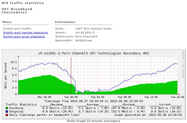 Az eset jól látszik a BIX statisztikáin is. Az éjféli beszakadás szinte azonnal lenullázta a UPC és a BIX közti forgalmat, de kisebb-nagyobb akadozások mellett hajnalban tényleg visszaállt az akkor szokásos értékre. A most délutáni kiesés egyelőre nem látszik a grafikonokon, előfordulhat, hogy csak kevés előfizetőt érintő lokális problémáról van szó.
