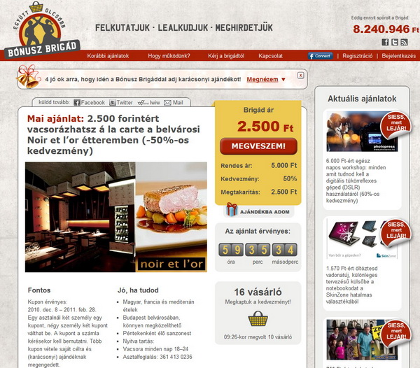Felhasználóként érdekes vásárlási helyzet az, amit a Bónusz Brigád kínál. Nem azt tudják megvenni látogatók, ami épp eszükbe jut, ez nem egy bazár, nem egy webáruház, nem egy aukciós oldal. Az első ajánlatok egy része rendezvényekhez és éttermekhez kapcsolódik Budapesten, ami leginkább a nyitott, aktív szociális életet élő embereknek kedvez. Ha egy olyan hely kerül fel, ahová egyébként is járnak, akkor olcsóbban megússzák a következő látogatást, de új helyek felfedezésére inkább alkalmas a rendszer.