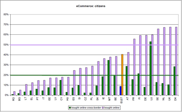 A Digitális Menetrend egyik fő célkitűzése, hogy az internetes kereskedelem, valamint ennek határokon átnyúló formái uniós szinten nagyobb lendületet kapjanak a következő években - ezen a területen bőven van mit behoznia Magyarországnak. Az Eurostat egységes adatgyűjtésén alapuló statisztika szerint a 16-74 év közti lakosság 18 százaléka vásárolt valamilyen terméket vagy szolgáltatást az interneten a múlt évben, ami kevesebb, mint fele a tavalyi EU-s átlagnak. Ennél is rosszabb azoknak az aránya, akik külföldről rendeltek terméket és szolgáltatást (2,9% szemben a 8,8 százalékos EU-s átlaggal).