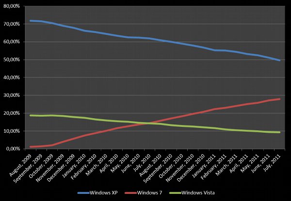 Júliusban a Windows XP részesedése már csak 49,8 százalék volt az internetezők körében, derül ki a NetMarketShare felméréséből. A Windows 7 a második legnépszerűbb operációs rendszer, részesedése megközelíti a 28 százalékot, a Windows Vistát az internetezőknek csak 9,7 százaléka használ..A különféle Windows-verziók még mindig a piac 87 százalékát adják, a második legnépszerűbb operációs rendszer a Mac OS X (3,8%), a harmadik pedig az iOS (2,8%) - ez egyáltalán nem meglepő annak a fényében, hogy már 222 millió iOS-t futtató eszköz került piacra, az iPod touchok, iPhone-ok és iPadek volumene messze felülmúlja a Mac PC-két.