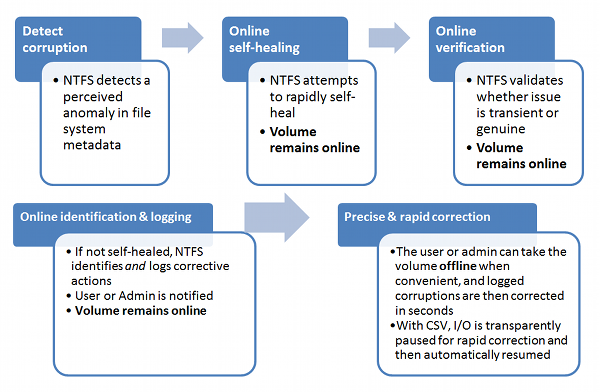 Amennyiben az utóbbi a helyzet, akkor a hiba javítása nem lehetséges működés közben, ezért a rendszer azonosítja és rögzíti a hibát, illetve informálja a felhasználót/rendszergazdát. A hibajavításról ettől fogva a felhasználónak kell gondoskodnia, az Action Center felkínálja a triviális megoldást, a számítógép újraindítását és a bootolás közbeni hibajavítást. A haladó felhasználókat nem kényszeríti újraindításra a rendszer, a (nem-rendszer) kötet manuálisan leválasztható és javítható - persze a futó alkalmazások panaszkodhatnak az elérhetetlen állományokra. A nagy újdonság, hogy a hibajavítás időtartama töredékére csökken az előző megközelítéshez képest, a rendszer ugyanis a hibák listáját már rögzítette, így csupán ezeket kell kipipálnia a futó alkalmazásnak.