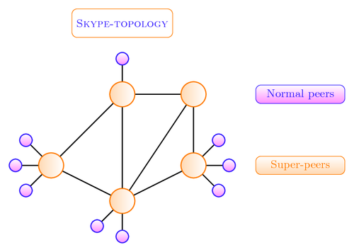 A Skype eredetileg a költségminimalizálás érdekében P2P topológiát épített fel, amelyben egyes felhasználók számítógépei működtek reléállomásként, egyszerre mintegy 48 ezer kliens látta el a supernode (szupercsomó) funkciót. A rendszer a supernode státuszt folyamatos rotációban osztotta ki a nagy felesleges sávszélességgel és számítási kapacitással rendelkező, inaktív felhasználók között. Egy-egy supernode mintegy 800 más felhasználót szolgált ki, feladata pedig a hívások felépítése volt - a beszélgetés által generált adatfolyam ezután a végpontok között közvetlenül közlekedett.