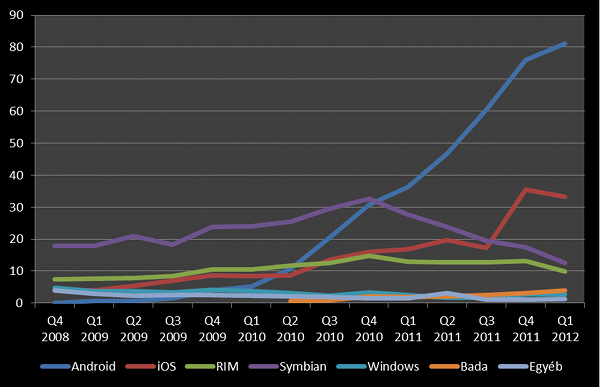 Az előző negyedévben megbotlott az Android, piaci debütálása óta először csökkent szekvenciálisan a piaci részesedése. Mivel a két nagy platform gyakorlatilag csak egymástól szerez felhasználókat, a törés mögött az Apple kirobbanó teljesítménye állt, az új iPhone bemutatkozása és az ünnepi negyedév egymásra csúszása minden korábbinál nagyobb eladásokat hozott a cupertinói cég számára. Az iPhone 4S sikere azonban úgy tűnik, nem tudta érdemben visszavetni az Android növekedését, a Google operációs rendszerét 81 millió új okostelefon futtatta, szemben az előző év hasonló időszakának 36 milliós adatával.
