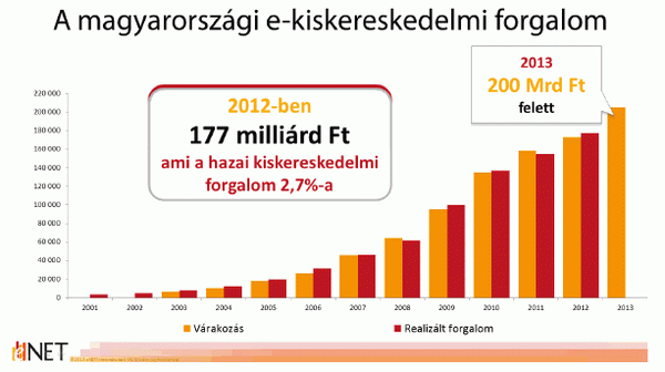 Az eNET tegnap megjelent kutatása szerint a magyarországi kiskereskedelmi forgalom 2,7 százalékát bonyolították a felek interneten keresztül, ami összességében 177 milliárdos forgalmat jelent a hazai online kereskedőknek. Az erős növekedés évek óta tendencia, várhatóan ez idén sem fog változni, 2013-ra a piac 200 milliárdos forgalmat vár.