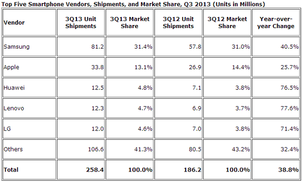 A Samsung megőrizte vezető pozícióját az okostelefon-piac élén, de érdemben nem tudta növelni részesedését, amely 31 százalékról 31,4 százalékra emelkedett. A dél-koreai gyártó természetesen így is hatalmas, egyedül nagyobb szelettel rendelkezik, mint a listán szereplő következő négy gyártó együttvéve. Növekedési üteme azonban nem volt számottevően magasabb, mint a teljes piacé, a 40,5 százalékos bővülés arra utal, hogy egy Samsung méretű cégnek már nem egyszerű lefedetlen piacokat találnia.