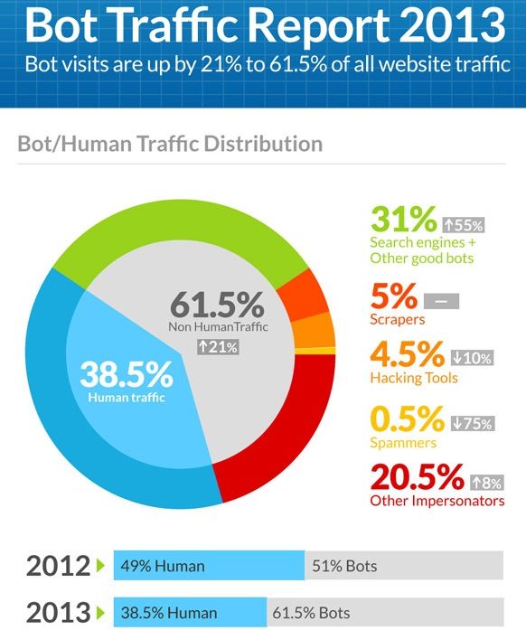 A nem-emberi forgalom az Incapsula mérései szerint elsősorban keresőrobotok, adattolvaj szkriptek, hacker eszközök és egyéb emberi megszemélyesítő robotokból adódik össze. A cég kalkulációi szerint az online forgalomnak jelenleg már csak 38,5 százalékát kezdeményezik emberek, a maradék 61,5 százalékban kizárólag gépek vesznek részt. Ezen belül 31 százalék, vagyis a gép forgalom fele a keresőrobotok és egyéb jóindulatú eszközök, botok forgalma.