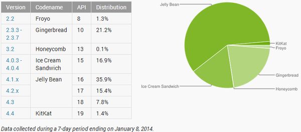 A legfrissebb, tavaly októberben megjelenő Android 4.4 KitKat viszont még alig 1,4 százalékos részesedést ért el, ez gyakorlatilag a Nexus okostelefonokat és tableteket, illetve a HTC, LG és Sony Google Play Edition eszközeit jelenti. Enyhe fordulatot a tavasszal megjelenő új modellek hozhatnak, amikor is várhatóan a nagy gyártók új modelljei már Android 4.4-gyel jelennek meg, illetve a tavalyi csúcskészülékek egy része is kap frissítést. A korábbiak esetében erre azonban továbbra sem lehet számítani, a HTC például éppen most jelentette be, hogy a 2012-es One X soha többé nem kap új gyári szoftvert.