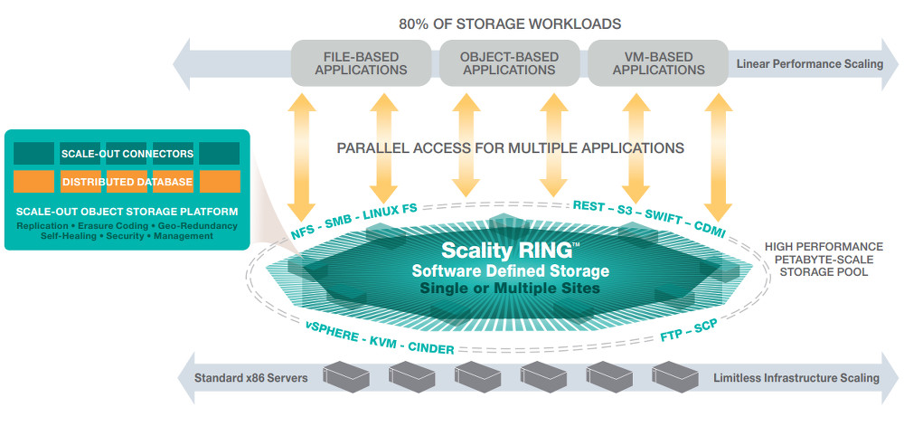 A Scalityt 2009-ben alapították tárolópiaci veteránok, akik például az EMC, a NetApp, a Fusion-IO vagy a VMware kötelékéből léptek ki, hogy egy teljesen hardverfüggetlen, tisztán szoftveres, skálázható elosztott tárolóplatformot építsenek. Ennek az erőfeszítésnek az eredménye a RING, amely segítségével akár több száz petabájtig méretezhető fájl-, objektum- és VM-tárolókat lehet építeni. Egy RING tároló egyszerre tudja ezeket, vagyis NAS-ként (SMB, NFS, FTP), objektumtárolóként (HTTP/REST, RS2, CDMI, OpenStack Swift) és VM-tárolóként (NFS, OpenStack Cinder) működik egyszerre. A cég szerint ezzel a vállalatok csökkenthetik a tárolóinfrastruktúrájuk bonyolultságát és a storage-adminok számát is.