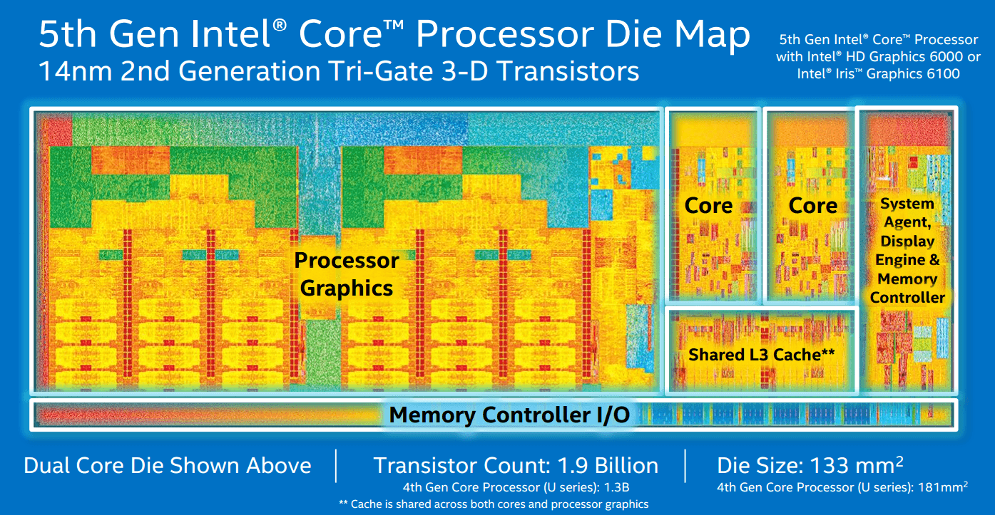 Most elrajtolt a következő hullám, amelyben a Broadwell-U sorozat kerül piacra, összesen 14 új processzor formájában. A frissen bejelentett processzorok két fogyasztási osztályban (15 és 28 wattos hőkeret) rajtolnak, utóbbiba a legerősebb grafikus egységgel szerelt darabok kerülnek. A Broadwell-U lapkák ugyanis egységesen két CPU maggal rendelkeznek, a GPU kiépítése szerint azonban négy különböző alfaj is létezik. A legerősebb (28 wattos fogyasztású) egységek kapják az Iris 6100 márkanéven futó GPU-t, ez 48 futószalagot használ modelltől függően 1000-1100 MHz-es maximális frekvencián. A következő verzió a HD 6000-es GPU, amely ugyanígy 48 végrehajtó egységet (execution unit, EU) tartalmaz, 950-1000 MHz-en, hőkerete azonban szigorúan 15 wattra limitált, így várhatóan kevesebbet futhat maximális órajelen.