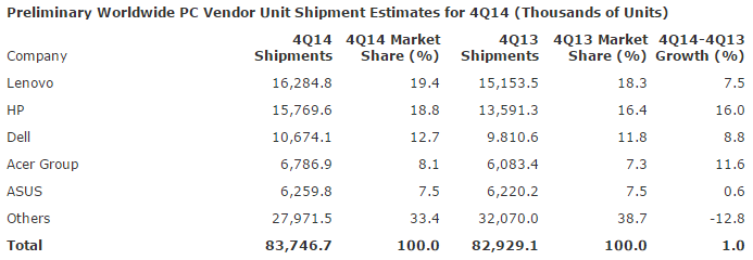 A gyártói ranglista érdemben nem változott, a piacvezető továbbra is a Lenovo, több szoros negyedév után a kínai cég egyre jobban elszakad a második helyezett HP-tól. A Lenovo részesedése 19,4 százalék volt, szemben a tavalyi 18,3 százalékkal, értékesítései egészséges (de nem kitörő) ütemben, 7,5 százalékkal bővültek. A cég eladásait Észak-Amerika és Európa húzta fel, más országokban csökkentek a szállítások. Az ezüstérémes HP is tudta növelni részesedését, 16 százalékos növekedéssel 18,8 százalékra emelkedett a kihasított tortaszelet mérete.