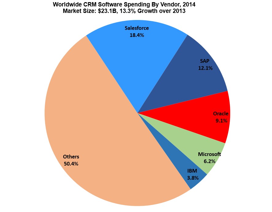 A Gartner legfrissebb piaci jelentése szerint a teljes CRM piac tavaly 13,3 százalékkal, 20,4 milliárdról 23,2 milliárd dollárra nőtt, ennek 47 százalékát pedig már SaaS-ra költötték a cégek. A piacvezető a Salesforce, 18,4 százalékos részesedéssel, a Microsoft a Gartner szerint 6,2 százalékot hasít ki a tortából az SAP és az Oracle mögött, de az IBM előtt, köszönhetően Dynamics CRM és Dynamics CRM Online termékeinek. A Salesforce azonban nem csak piacvezető, de a leggyorsabb növekedést is mutatja, éves szinten (2013-ról 2014-re) 28,2 százalékkal tudott nőni, messze a teljes piac üteme fölött.