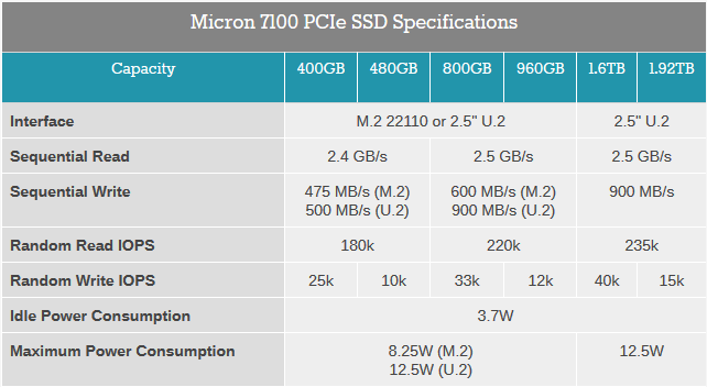 A Seagate együttműködésével tervezett Micron 7100 ezeknél valamelyest szerényebb értékeket kínál, a kapacitástól függően M.2 vagy U.2 formátumú SSD-kben ugyanis a munkaállomásokhoz, illetve szerényebb vállalati környezethez tervezett Marvell 88SS1093 vezérlő dolgozik. A tárolók olvasási sebessége 2,4 és 2,5 GB/s között alakul, az írási tempó pedig 475 és 900 MB/s között változik. A meghajtók maximális fogyasztása 8,25 vagy 12.5 watt lehet.