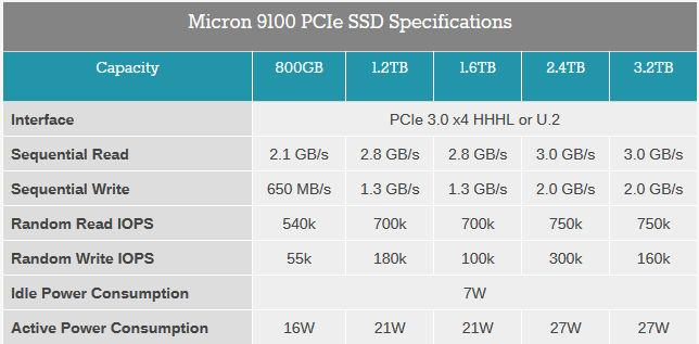 A félmagas PCI Express bővítőkártya (HHHL), vagy 2,5 hüvelykes U.2 csatolós meghajtó formájában is elérhető Micron 9100 kapacitása 800 és 3,2 terabájt között mozog. A PMC-Sierra vezérlős termékek olvasási értéke 2,1 és 3 GB/s, az írási tempó pedig 650 MB/s és 2 GB/s között változik. Mindehhez terhelés mellett kapacitástól függően legfeljebb 16 és 27 watt közötti érték társulhat.