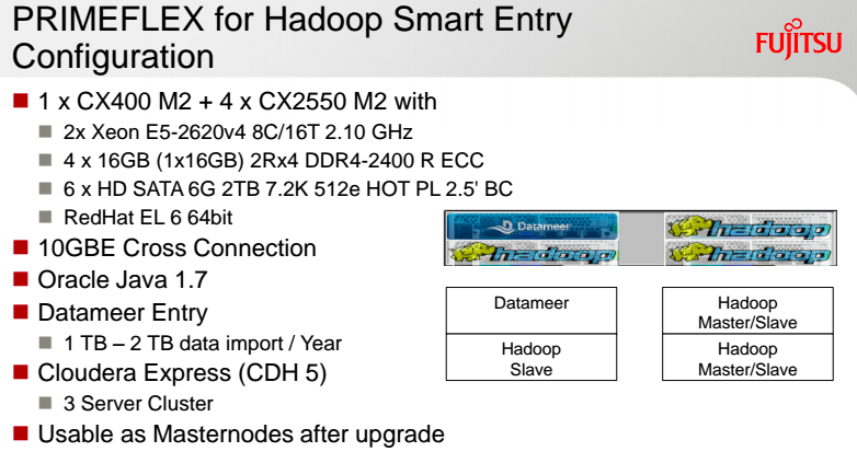 A belépő modellt alapszintű Hadoop rendszerekhez kínálja a gyártó, például pilot projektekhez vagy kisebb cégek, részlegek munkájához. Ez a Fujitsu Primergy CX400-as rendszerre épül, ez összesen négy, egyenként két foglalatos szervert foglal magában. A négy node egyike a Datameer szoftverét futtatja, a maradék három pedig a Hadoop-klasztert alkotja. A Hadoop nagyon érzékeny a jó hálózati kapcsolatra, ennek megfelelően a klaszter tagjai egymással 10 gigabites Etherneten kommunikálnak (háromszög alakban), míg egy-egy pont-pont kapcsolatot a Datameer kiszolgálóval is fenntartanak (ez gigabites kapcsolatot igényel). Ezt a rendszert a Hadooppal (és általában a Big Datával) még csak barátkozó, azt csak szűkebb területen használó szervezeteknek ajánlja a Fujitsu.