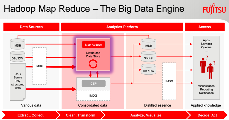Dedikált célgépeket, integrált hardver-szoftver megoldásokat kínál a Fujitsu a legnépszerűbb nyílt forráskódú Big Data platform alá. A tesztelt és minősített rendszerekkel gyorsan és különösebb erőfeszítés nélkül kiépíthetőek a saját Hadoop rendszerek.