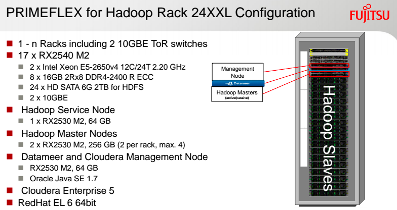 Saját Hadoop-célgépekkel jelentkezik a Fujitsu. A szoftveres oldalt Red Hat Enterprise Linux adja, ezen fut a Datameer analitikai és vizualizációs motorja, ezt táplálják adattal a Cloudera Hadoop-disztribúcióját futtató szerverek adattal. A kulcsrakész rendszereket a vásárló igényei szerint több konfigurációban és támogatási konstrukcióval kínálja a Fujitsu, így "tanuló rendszernek", és igazi nagyvállalati Big Data appliance-nek is bevethető - a lefedett spektrum nagyon széles.