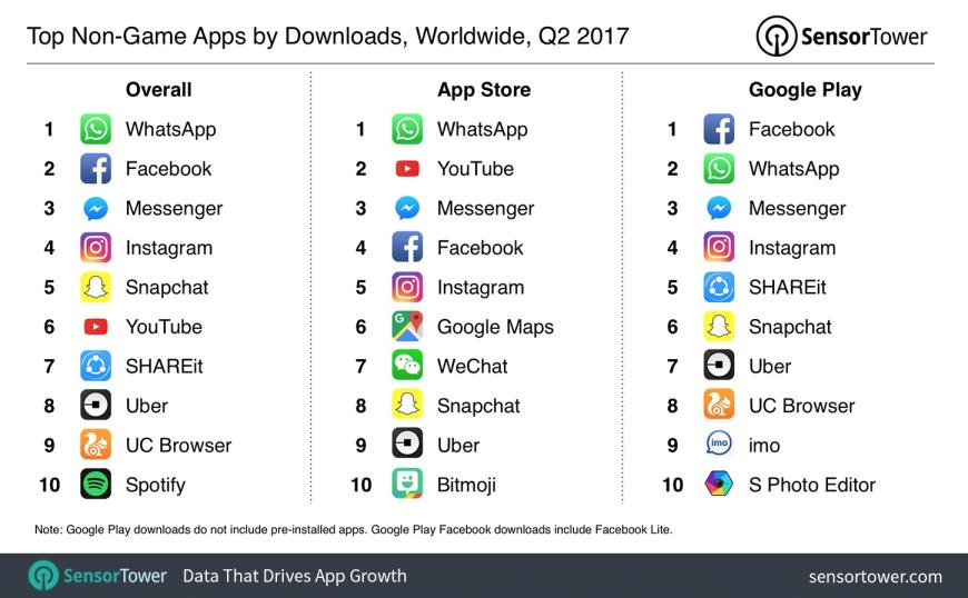 Alkalmazásletöltések szempontjából a WhatsApp vezeti a világszintű (nem játékokra vonatkozó) listát és az App Store letöltéseit, míg a Google Play-ben ez csak a második helyre csúszott. Az androidos telefonokra a Facebook kliensappot töltöttek le a legtöbben, amely a globális listában így a második helyet szerezte meg, az App Store-ban pedig csak negyedik - ezek az adatok magukban foglalják a például Indiában nagyon népszerű Facebook Lite letöltéseit is. A harmadik helyen egységesen mindenhol a Messenger áll, az Instagram pedig a 4-5. helyen, tehát lényegében Zuckerberg birodalma uralja a letöltéseket - kivéve az App Store-ban második helyre bekerülő YouTube-ot. A listák dobogós helyeiről például a Snapchat, a SHAREit, az Uber, az UC Browser, a WeChat és a Bitmoji csúszott le.