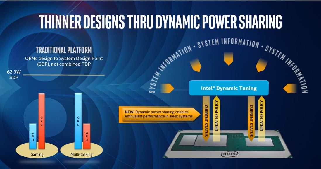 A két GPU közötti egyik legfőbb különbség a fogyasztásban (na meg persze a számítási teljesítmény) rejlik, ezek függvényében a komplett egységre vonatkozó keret 100 watt illetve 65 watt, amit némileg alacsonyabb maximális órajelek mellett leginkább az energiamenedzsment segítségével ért ez az Intel-AMD páros. Az Intel Dynamic Tuning névre keresztelt technológia lehetővé teszi a rendelkezésre álló hőkeret dinamikus elosztását a CPU és a GPU között, terheléstől függően, a maximális teljesítmény érdekében. Ez mind a CPU, mind pedig a GPU aktuális fogyasztását folyamatosan nyomon követi, illetve figyelembe veszi a mindenkori órajelek és feszültségek meghatározásánál.