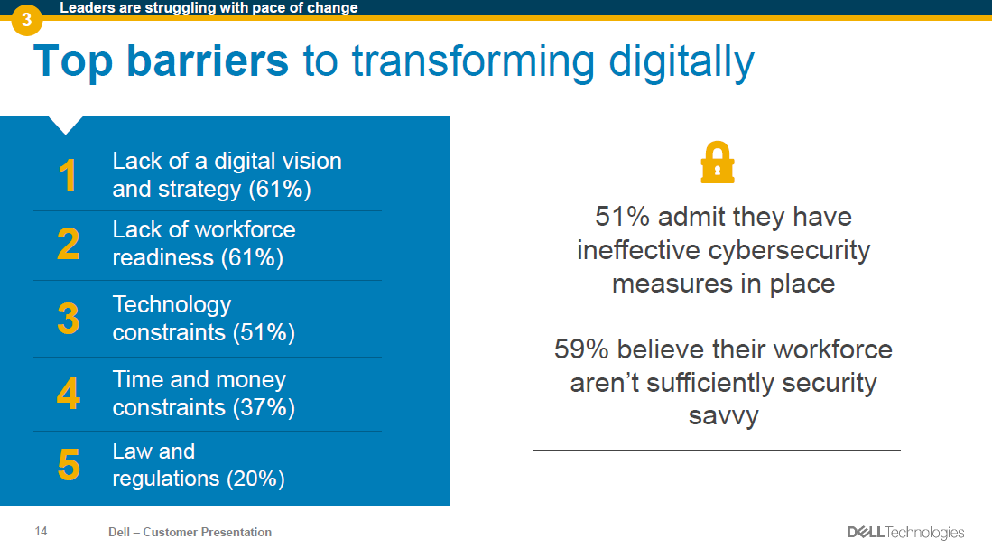 A tanulmány publikálásának apropóján Budapestre látogatott a Dell EMC EMEA régióért felelős elnöke, Aongus Hegarty, illetve a CEE régiót vezető alelnök, Anja Monrad. A HWSW kérdésére Hegarty elmondta, hogy cége több tényező miatt is képes segítő kezet nyújtani bizonytalan partnereinek az útkeresésben. Technológiai vállalatról révén szó a Dell EMC az IT-piac folyamatosan és gyorsan változó pályáján mozog, ami miatt az elmúlt több, mint három évtized során számos átalakuláson kellett keresztülmenjen a cég. A vállalatnak tehát kvázi lételeme a változás, így az ezzel járó, különféle folyamatokban otthonosan mozog.