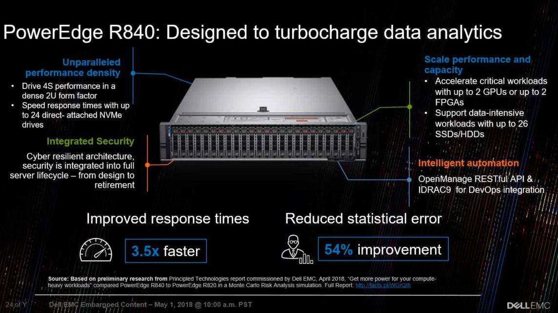 A tárolós frissítések mellé két új szerver csatlakozott. A piac aktuális hívószavát meglovagolva kifejezetten számításigényes (AI, analitika) feladatokhoz készített négyutas kiszolgálókat a Dell a PowerEdge R840, illetve a PowerEdge R940xa személyében. A 2U kivitelű PowerEdge R840-be akár négy, egyenként 28 magos Skylake-SP Xeon processzor is beépíthető. A memória maximális kapacitása 6 terabájtra rúghat, amelyből 384 gigabájt NVDIMM is lehet. A háttértár szerepét SAS és SATA csatolós 2,5 hüvelykes SSD-k mellett 24 darab NVMe PCIe SSD is betöltheti, legfeljebb 153 terabájt kapacitásig.
