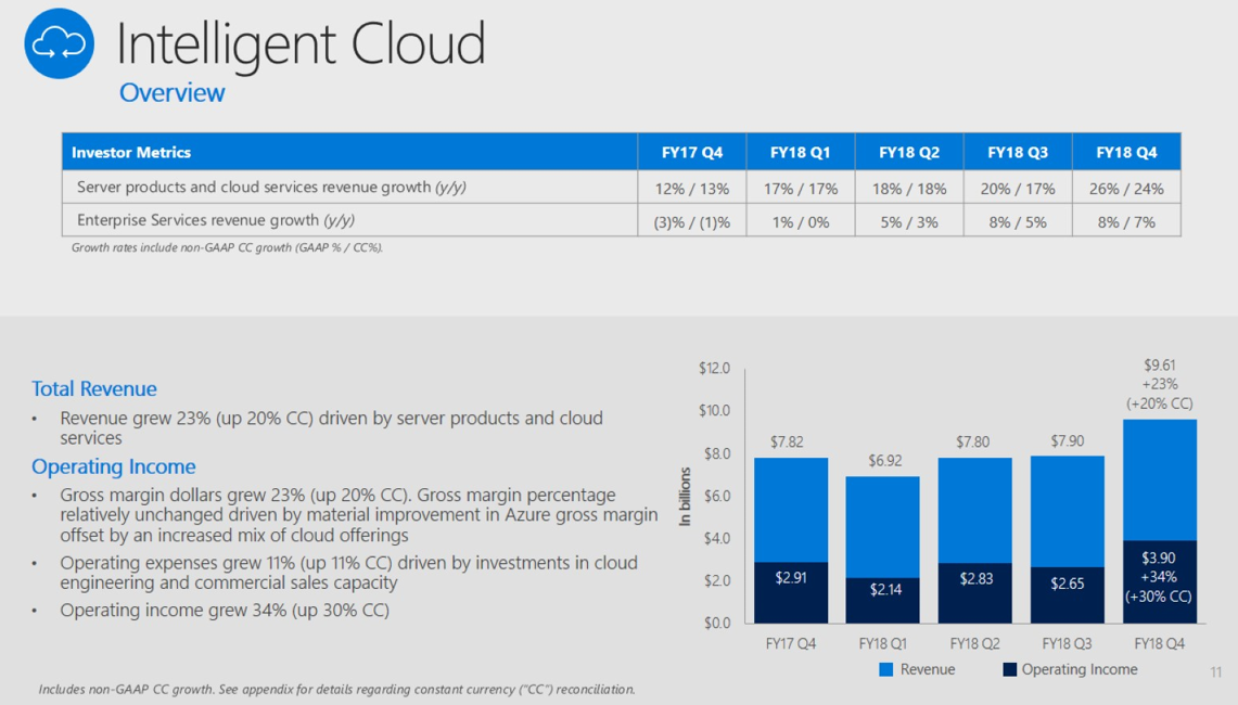 A legnagyobb növekedési ütemet az Intelligent Cloud üzletág, amely a szerveres termékeket és a felhős szolgáltatásokat is tömöríti, bevétele 9,6 milliárd dollárra nőtt, ez 20 százalékos emelkedés (konstans valutaárfolyamon számolva). Ezzel pedig a részleg teljesen felzárkózott a két, korábban lényegesen nagyobbnak számító mögé, és nem kizárt, hogy akár egy éven belül a Microsoft legnagyobb üzletága legyen. Ami e növekedésnél is sokatmondóbb, hogy az üzemi eredmény 30 százalékkal nőtt, 3,9 milliárd dollárra, ezzel ha még nem is a legnagyobb, már a legjövedelmezőbb tevékenységgé avanzsált, megelőzve az Office-t.