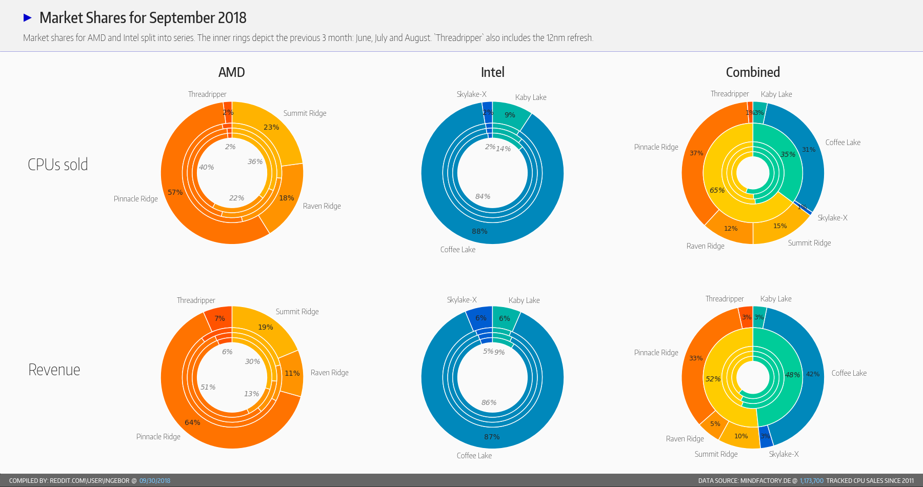 Részletes bontásban közölte szeptemberi, illetve az azt megelőző egy évre vonatkozó asztali processzoreladásainak statisztikáit a német Mindfactory webshop. A hazánkhoz képest lényegesen kevésbé árérzékeny piacon az AMD már átvette a vezetést, a kisebbik x86-os szereplőtől származott a kiskereskedelmi forgalomban értékesített desktop processzorok szinte pontosan kétharmada. Bár forgalomban kisebb az AMD előnye, a Zennel feltámadott cég már a kasszában landolt bevételben is átvette a vezetést, az asztali processzoros eladásokból befolyt összeg 52 százaléka származott Ryzenekből és Threadripperekből.