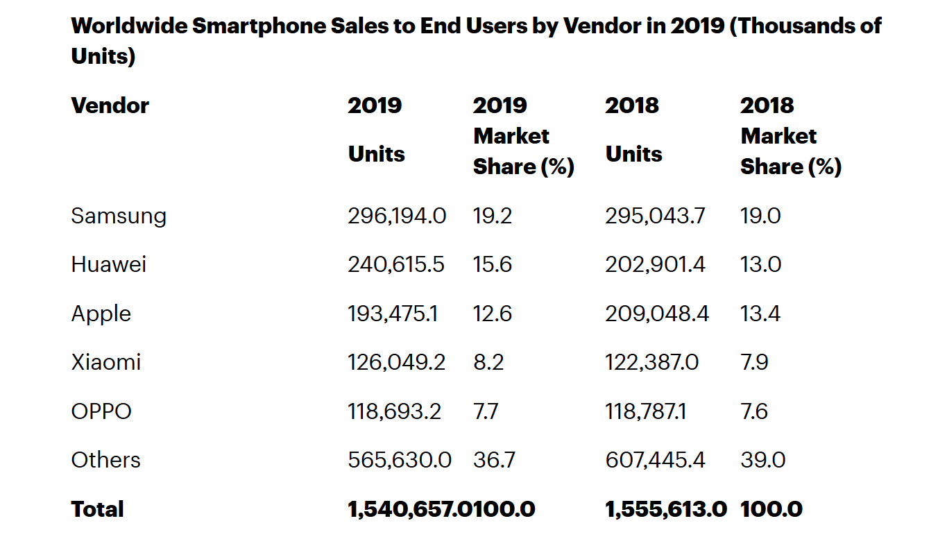 A teljes 2019-es évet nézve kissé átalakul a mezőny, noha azt még így is a Samsung vezeti, a megelőző évi eredménynél egy hajszállal több, 296,2 millió eladott telefonnal. Ez 0,2 százalékpontos piacrész-növekedést hozott a gyártónak amely így az évben a szegmens 19,2 százalékát uralta - céget főként a középkategóriás eszközök hajtották.