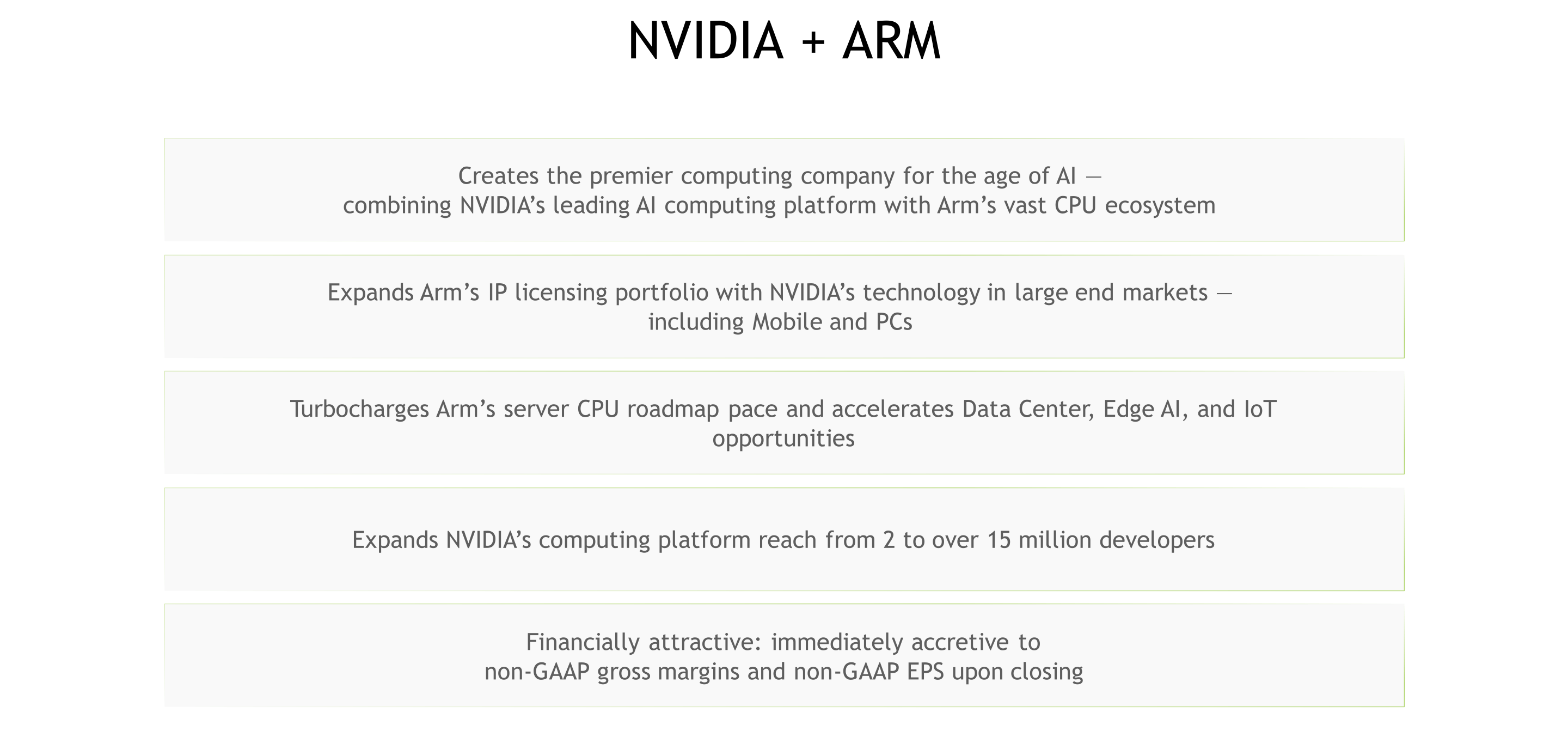 Közleményében az Nvidia kiemelte, hogy piacvezető grafikus és gépi tanulásos fejlesztéseit az ARM gazdag ökoszisztémájával ötvözve páratlan technológiák és termékek születhetnek a jövőben. A vásárló ígéri, hogy az okostelefonos piac számára kulcsfontosságú licencelési struktúra nem változik, az ARM központja pedig az Egyesült Királyságban található Cambridge-ben marad, valamint különféle beruházások keretében a jövőben tovább bővül majd. Ezzel együtt a felvásárlás jelentősen átrendezheti a félvezetőiparban aktuálisan uralkodó erőviszonyokat, melynek hosszútávon számottevő következményei lehetnek.