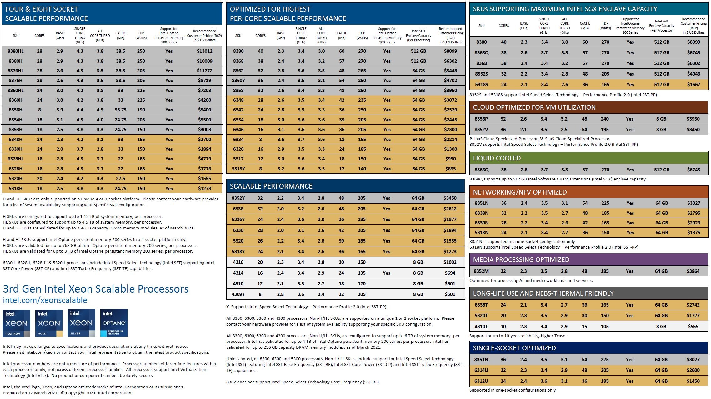 Az egyes Platinum, Gold, valamint Silver (a Bronze márkanevet kivezette az Intel) modellek között a magszám, az órajel, az L3 cache kapacitása, a támogatott memória sebessége, a TDP, az SGX enklávé kapacitása, illetve végül, de nem utolsó sorban az árazás jelentheti a legfőbb különbséget. A csúcsmodellt most is a 80-ra végződő Platinum 8380 képviseli (nettó 8100 dollárért), egyedüliként 40 aktív processzormaggal, ami a 10 nanométer ellenére a korábbinál magasabb, 270 wattos TDP-t kíván. A várhatóan leginkább népszerű Gold sorozatot most is két részre, 5000-es és 6000-es modellekre bontotta az Intel. Előbbi 8 és 26, utóbbi 8 és 32 mag között skálázódik, miközben a 6000-es típusok órajele jellemzően magasabb.