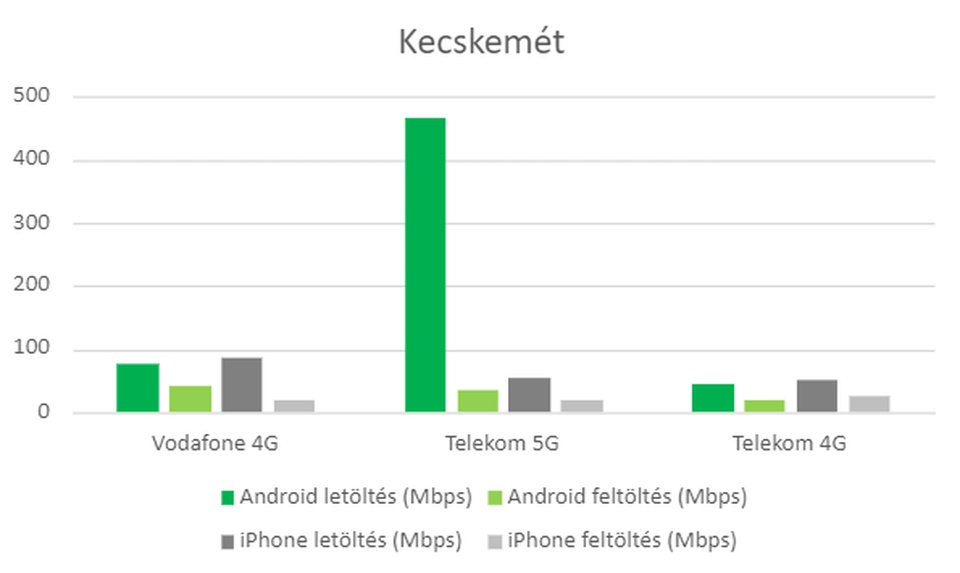 A kecskeméti helyszínen mértük a legnagyobb - több mint tízszeres - különbséget a Telekom 5G-s és 4G-s infrastruktúrája közt letöltési irányban, bár ehhez alighanem hozzájárulhatott a cella terheltsége, legalábbis erre utal, hogy a Vodafone hálózata kisebb vivőkapacitással helyenként jobb eredményeket produkált 4G-n a Telekomnál.