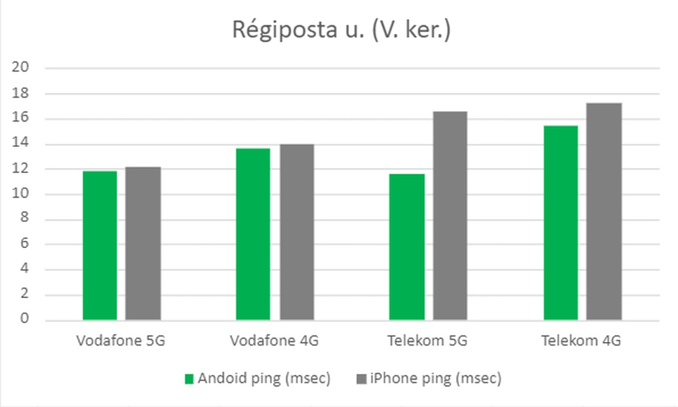 A Vodafone 5G-s DSS-alapú hálózatára az iPhone 12 Pro Max fel sem tudott jelentkezni, míg a Galaxy S21+ esetében hajszálnyival jobb lett a 4G-s letöltési sebesség, az 5G-s hálózat visszirányban viszont lényegesen gyorsabb volt. A Telekom hálózata ezen a helyszínen nem brillírozott a letöltésben, viszont jó feltöltési értékeket hozott, szintén érdekesség továbbá, hogy az iPhone a 4G-s Vodafone hálón számottevően lassabbnak bizonyult, mint a Galaxy S21+.