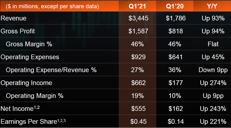 A chiptervező 3,45 milliárd dolláros bevételt regisztrált az első negyedévben, amely mintegy 93 százalékkal múlja felül az egy évvel korábbi 1,79 milliárdot. A vállalat ezzel immár a hatodik egymást követő negyedévben tudta növelni forgalmát. A nyereség ennél is nagyobb mértékben, 243 százalékkal nőtt, 555 millió dollárt hagyva az AMD kasszájában. Az vállalat szerint a kedvező számok mögött elsősorban az elmúlt hónapokban bemutatott vadiúj termékek, vagyis az ötödik generációs Ryzen, a harmadik generációs Epyc, illetve második generációs a Navi-alapú Radeonok állnak. A versenyképes termékek iránt ráadásul kiugró a kereslet, köszönhetően a PC- és a szerverpiac elmúlt hónapokban mutatott dinamikus növekedésének.