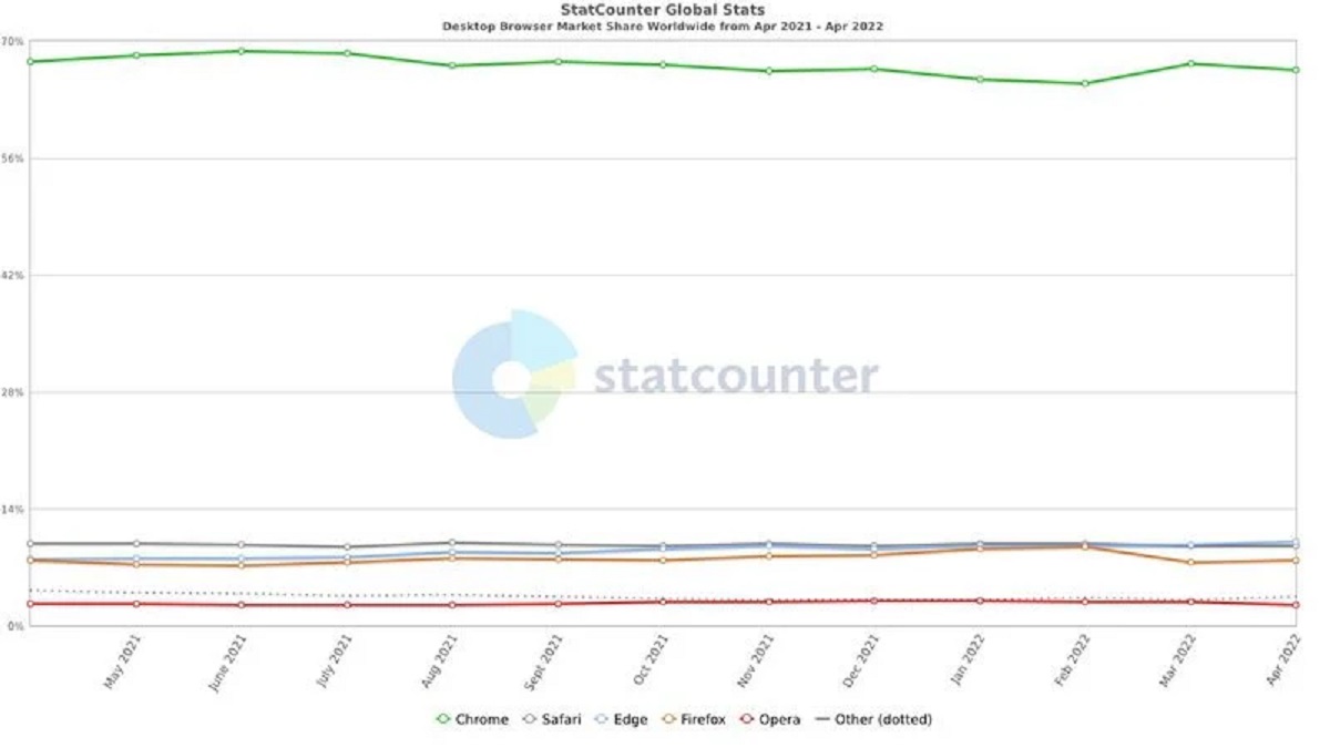 Az asztali számítógépek és mobileszközök összesített statisztikáit nézve az alábbi szerint alakul a sorrend: Google Chrome (64,36%), Safari (19,13%), Microsoft Edge (4,07%). Ezeket követi a Mozilla Firefox (3,41%), a Samsung Internet (2,84%) és az Opera (2,07%).